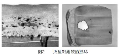 除了高溫?zé)龤猓瑹煔庵械幕鹦菍V袋的損害也是非常嚴(yán)重的。如焦?fàn)t、干燥窯、鏈條爐、沖天爐、電爐、高爐、混鐵爐等在生產(chǎn)過程中會有大量的火星混入煙氣中,如對火星處理不及時,尤其是濾袋表面粉塵層較薄時,火星就會將濾袋燒穿,形成不規(guī)則的圓洞(如圖2)。但當(dāng)濾袋表面粉塵層較厚時,火星不會將濾袋直接燒穿,而會造成濾袋表面形成深顏色的烘烤痕跡。