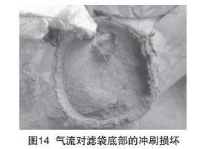 由于噴吹管內(nèi)的氣流為橫向運行,當(dāng)導(dǎo)流管設(shè)置不 當(dāng)時,產(chǎn)生的噴吹管氣流就不是垂直而是傾斜向下噴入 濾袋,就會造成袋口部位下方約300mm處產(chǎn)生由內(nèi)向外 的破損(如圖12、13所示)。