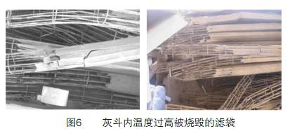 高溫粉塵被收入灰斗后,如果不能及時排出,粉塵會長期蓄積在灰斗里造成灰斗內(nèi)溫度不斷升高,濾袋長期在高溫烘烤下就會變脆、變硬,嚴(yán)重時則會燒毀,尤其是粉塵中含有的易燃物質(zhì),會在灰斗內(nèi)燃燒,從而燒毀濾袋(如圖6)。