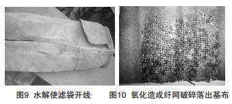 纖維氧化是纖維中分子失去(或離解)電子的過程,如PPS纖維,在高溫(150℃)條件下氧分子攻擊分 子中的“S”,并與之結(jié)合。造成PPS纖維變色、變硬、 變脆,強度降低而破損,嚴(yán)重時纖網(wǎng)會破碎而脫離基布 (如圖10)。氧化是濾袋損壞的又一主要因素。抗氧化 性能較差的濾料主要有:聚丙烯、聚苯硫醚(PPS)等。